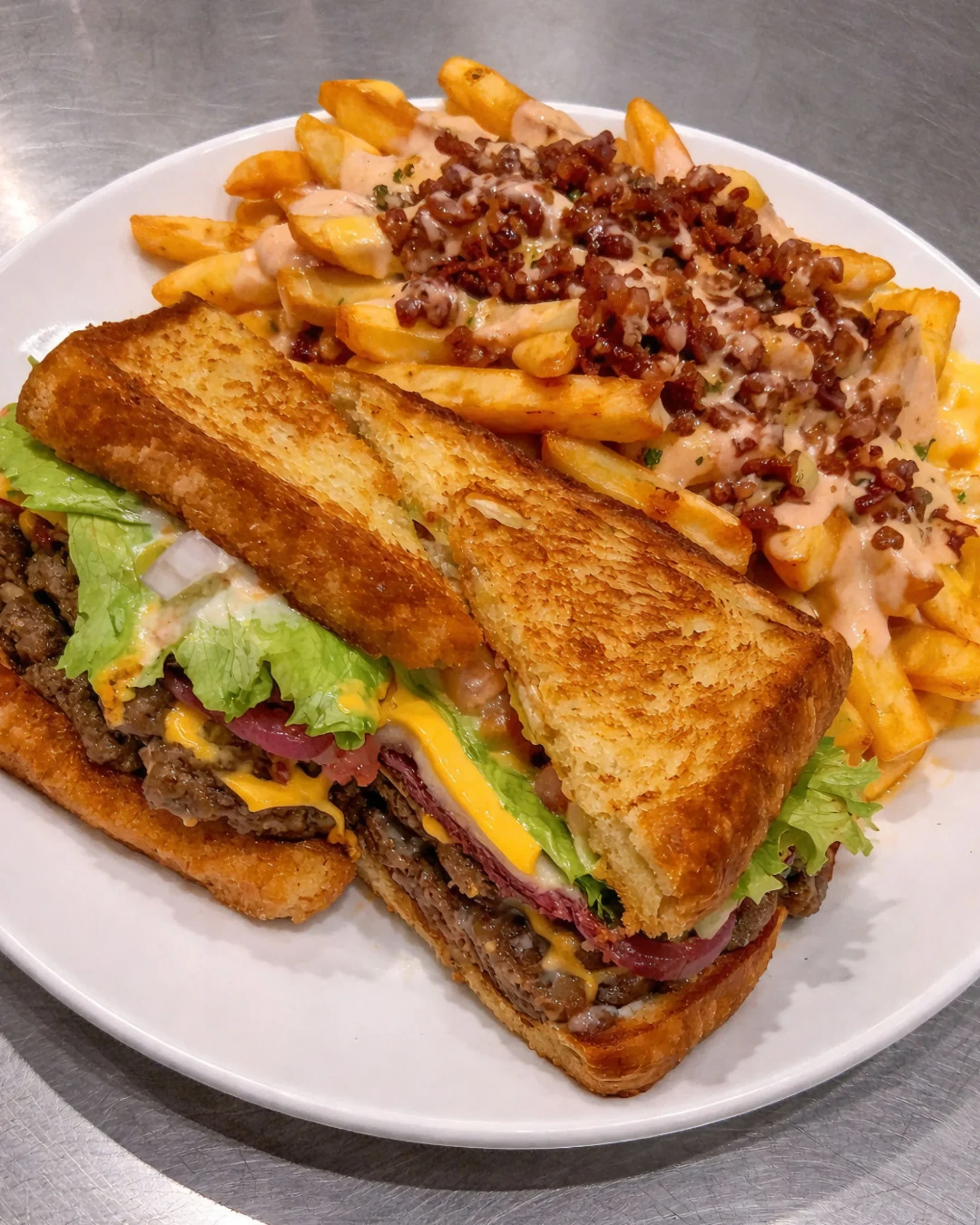 This indulgent combo delivers major flavor and texture: a golden, buttery toasted sandwich packed with juicy beef, melted cheese, crisp lettuce, and tangy pickles—served with crispy fries smothered in creamy sauce and crispy bacon bits. It’s the ultimate comfort meal made right at home.