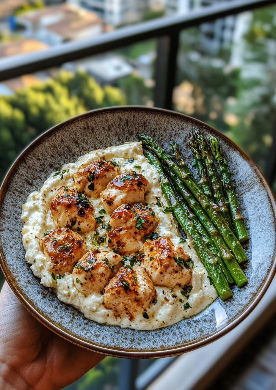 This dish delivers bold Mediterranean flavors with a kick of chili. Tender Greek-spiced chicken bites are served over a smoky, rich feta cream, paired with roasted asparagus crusted in parmesan. It’s the kind of plate that feels indulgent yet fresh and nourishing.
