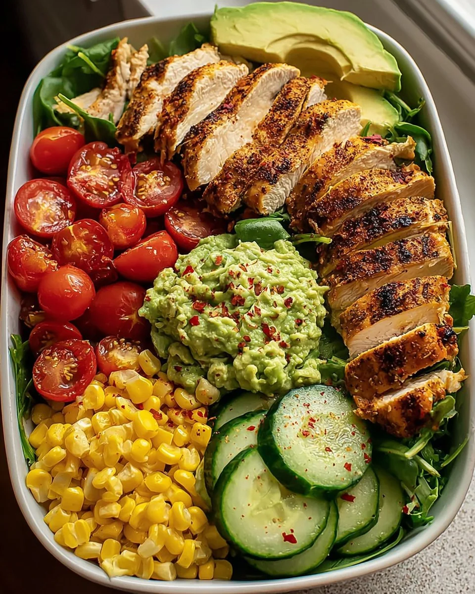 This Grilled Chicken Salad Bowl with Guacamole & Fresh Veggies is a vibrant and nutritious meal loaded with flavor and color. Juicy grilled chicken sits atop a bed of greens and is surrounded by a variety of fresh vegetables and creamy guacamole. Perfect for lunch or dinner, it’s satisfying, wholesome, and packed with nutrients.