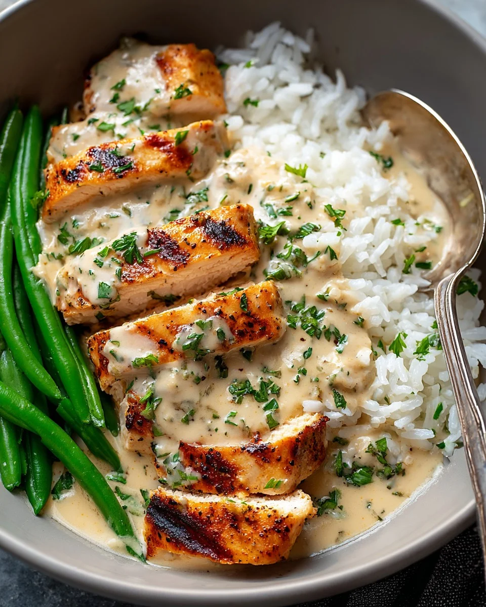 This Grilled Chicken with Creamy Garlic Herb Sauce served alongside fluffy white rice and tender green beans is a delicious, well-balanced meal that’s full of flavor. The juicy grilled chicken is topped with a rich, garlicky herb sauce that ties the whole plate together beautifully.
