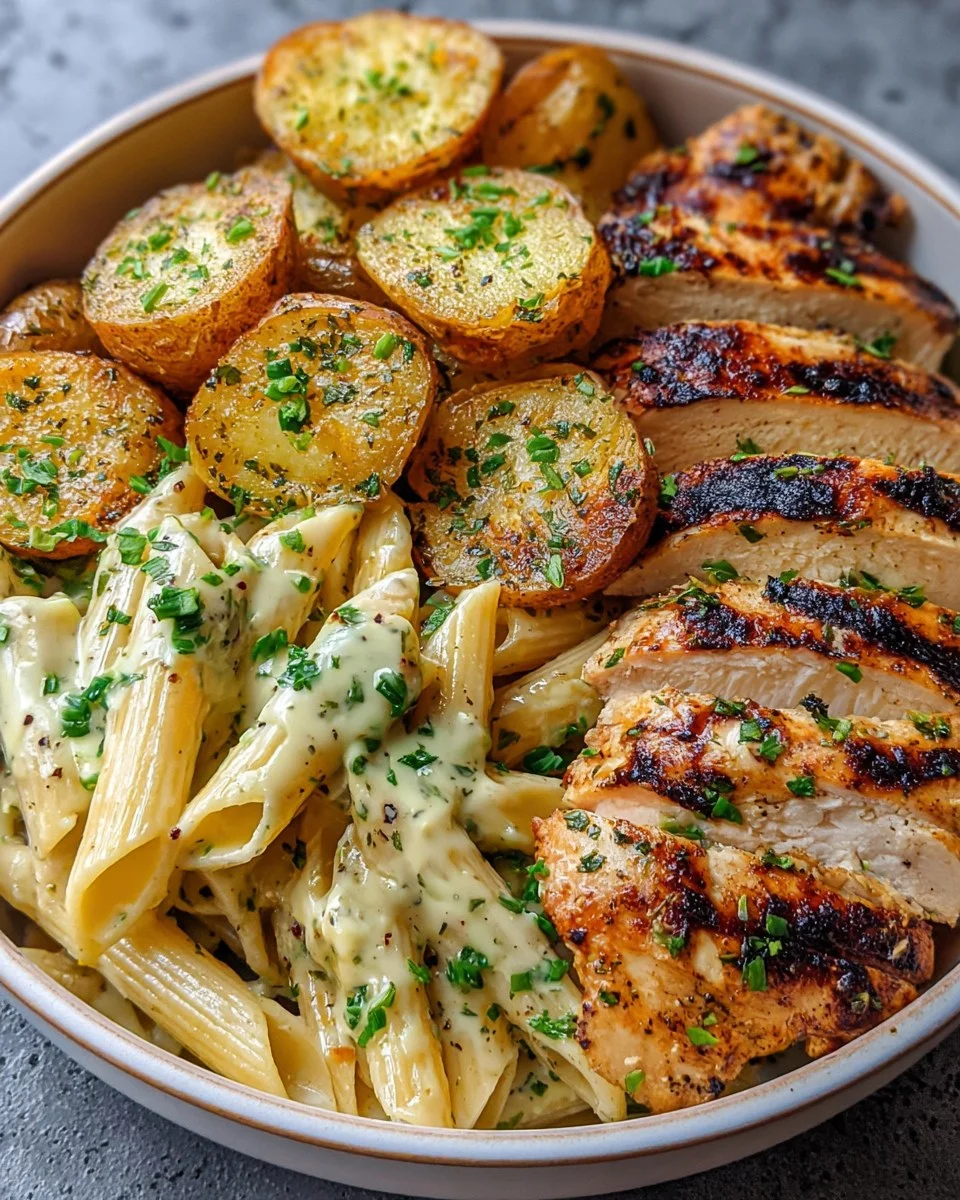 This Grilled Herb Chicken Bowl with Garlic Cream Pasta & Crispy Potatoes is a hearty and flavor-packed meal that brings together perfectly grilled chicken, creamy garlic herb pasta, and golden roasted baby potatoes. It’s the ultimate comfort food bowl that’s as satisfying as it is delicious.
