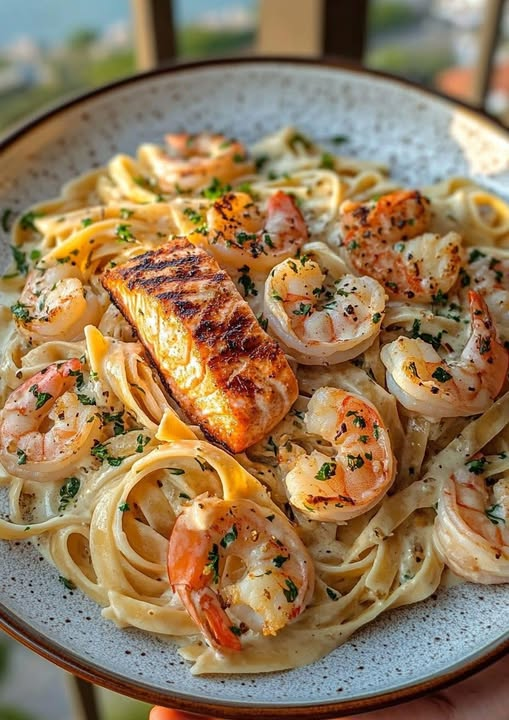 Grilled Salmon & Shrimp Fettuccine Alfredo is a decadent seafood pasta dish that delivers elegance and comfort in every bite. Creamy Alfredo sauce coats tender fettuccine, while juicy shrimp and perfectly grilled salmon crown this restaurant-worthy meal. It’s ideal for special occasions or indulgent weeknight dinners.