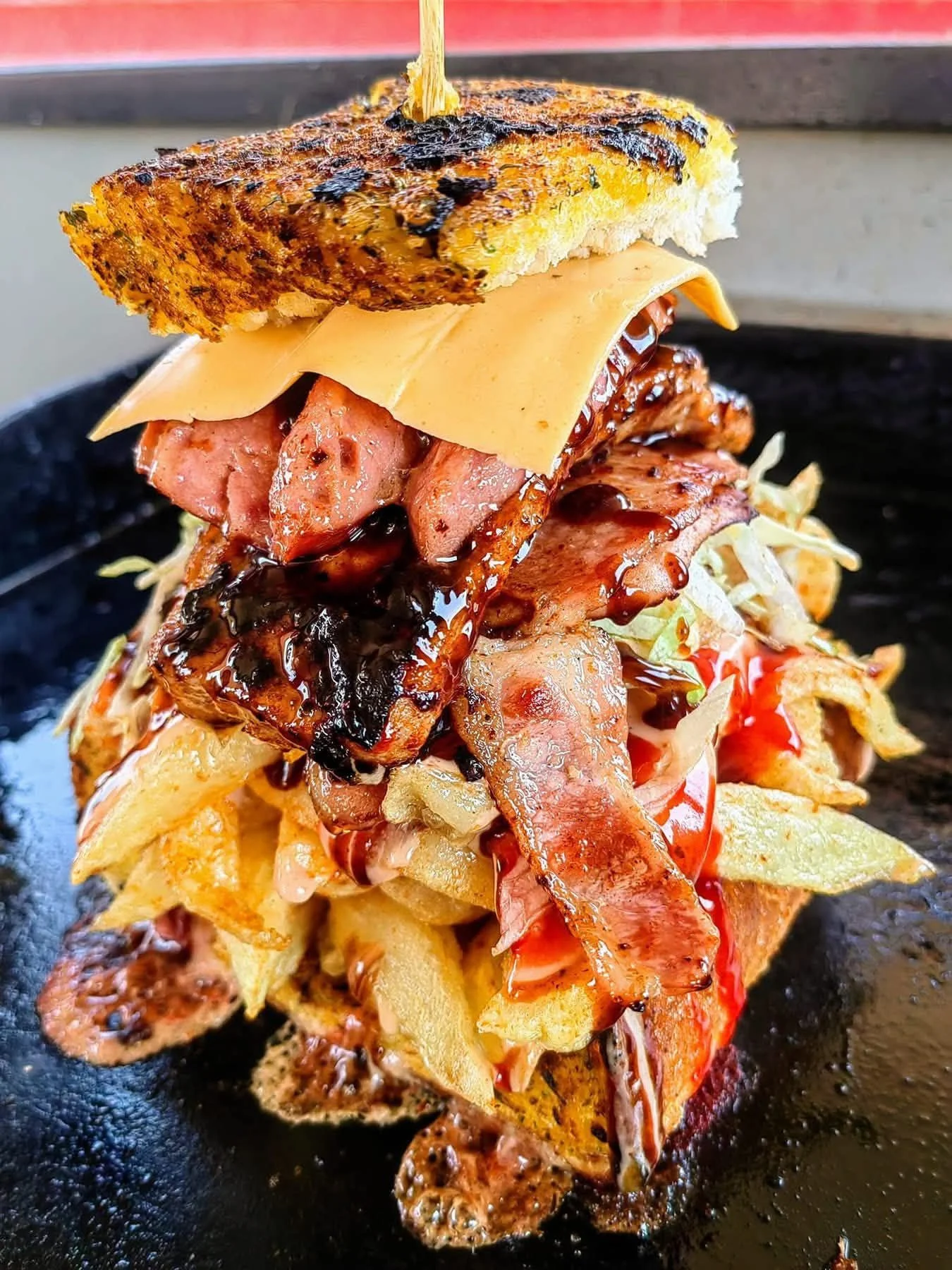 Start your week off with this bold and indulgent Kota-style stack — a South African street food legend! This loaded tower features flame-grilled bread, crispy fries, juicy sausages, savory bacon, gooey cheese, shredded lettuce, and tangy sauces all stacked into a handheld feast.