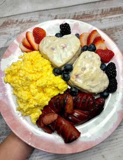 A delicious and satisfying breakfast plate featuring fluffy scrambled eggs, juicy sausages, fresh berries, and creamy-topped pancakes. This balanced meal is perfect for starting your day with energy and flavor.
