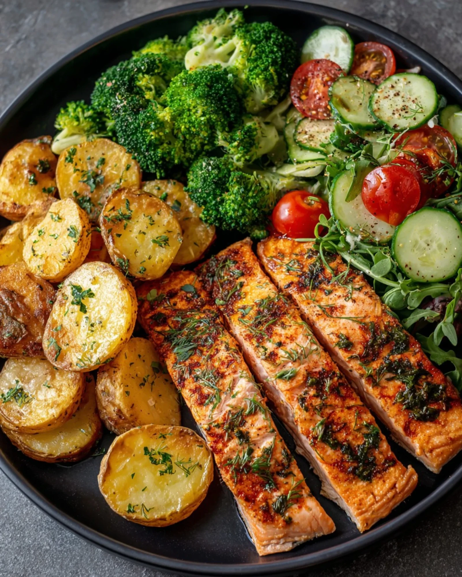 This Herb-Crusted Baked Salmon is bursting with flavor and pairs perfectly with crispy golden potatoes, tender broccoli, and a refreshing cucumber tomato salad. It’s a nutritious and colorful meal that’s easy enough for a weeknight dinner and elegant enough for guests.