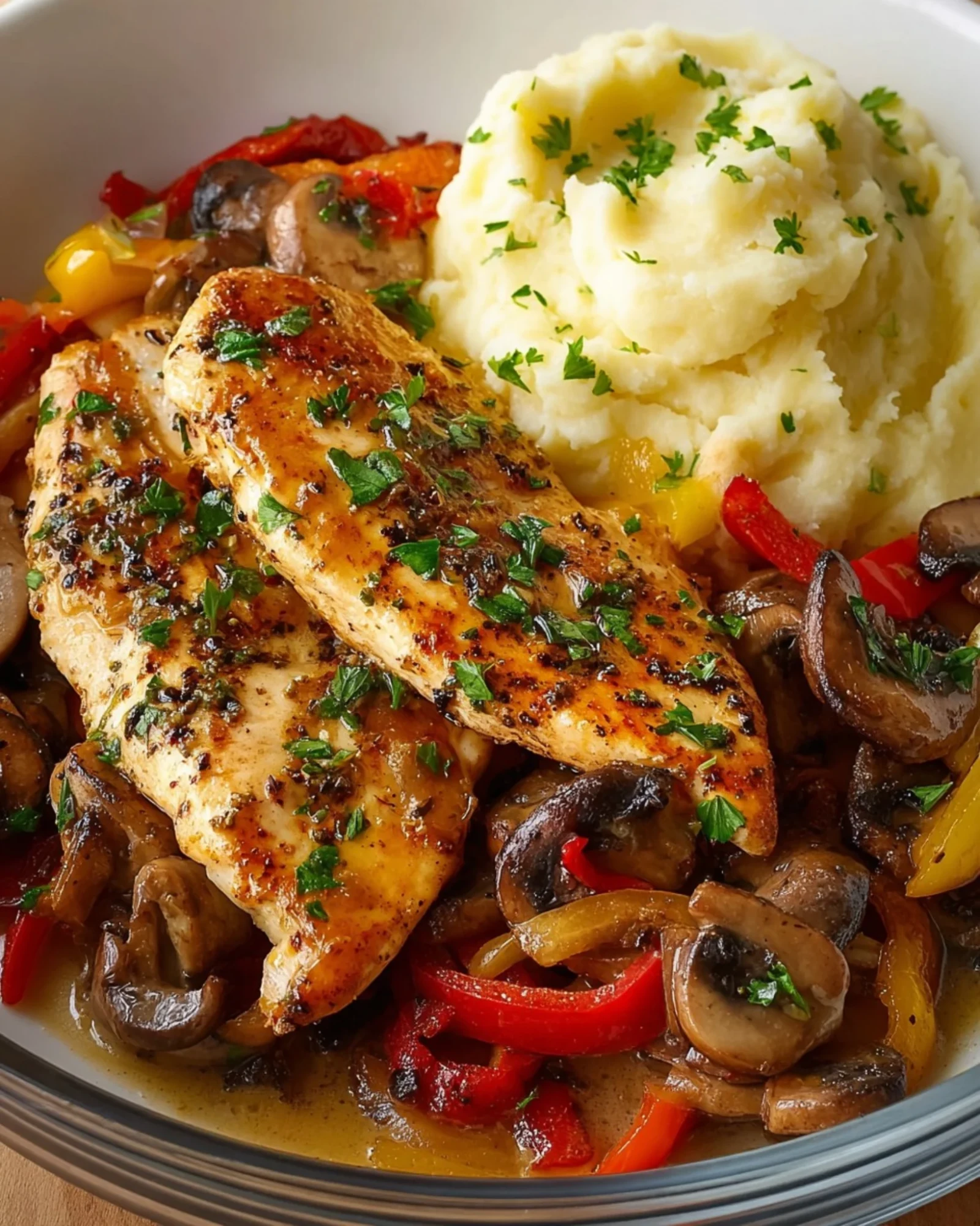 This comforting, flavor-packed dish brings together juicy herb-crusted chicken, a medley of vibrant sautéed bell peppers and earthy mushrooms, and the ultimate side of creamy mashed potatoes. Perfect for a hearty dinner or special occasion, it’s a well-rounded plate of deliciousness that will satisfy every craving.