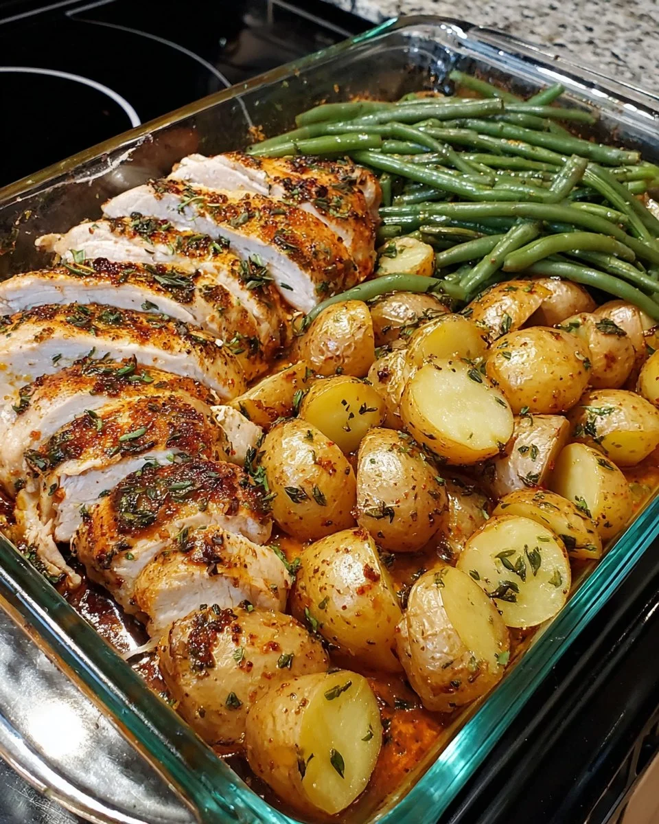 This Herb-Roasted Chicken Breast with Baby Potatoes & Green Beans is a wholesome, flavorful one-dish meal perfect for a busy weeknight or a cozy Sunday dinner. Juicy, herbed chicken breast roasts alongside tender baby potatoes and fresh green beans, all infused with savory garlic and herbs.