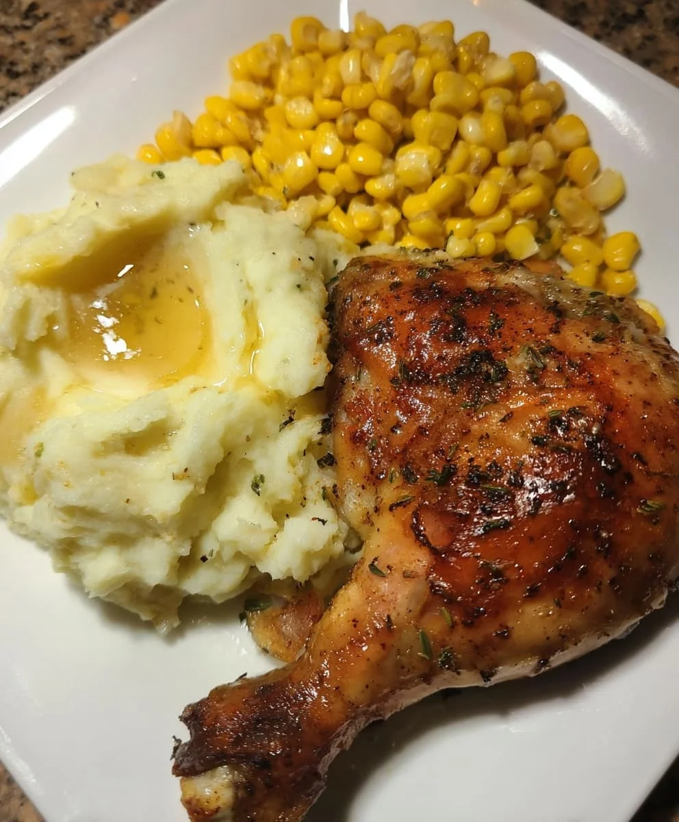 This hearty and comforting dish features juicy herb-roasted chicken paired with creamy mashed potatoes and sweet buttery corn. It’s a classic dinner that’s both satisfying and simple to make, perfect for family meals or cozy evenings.