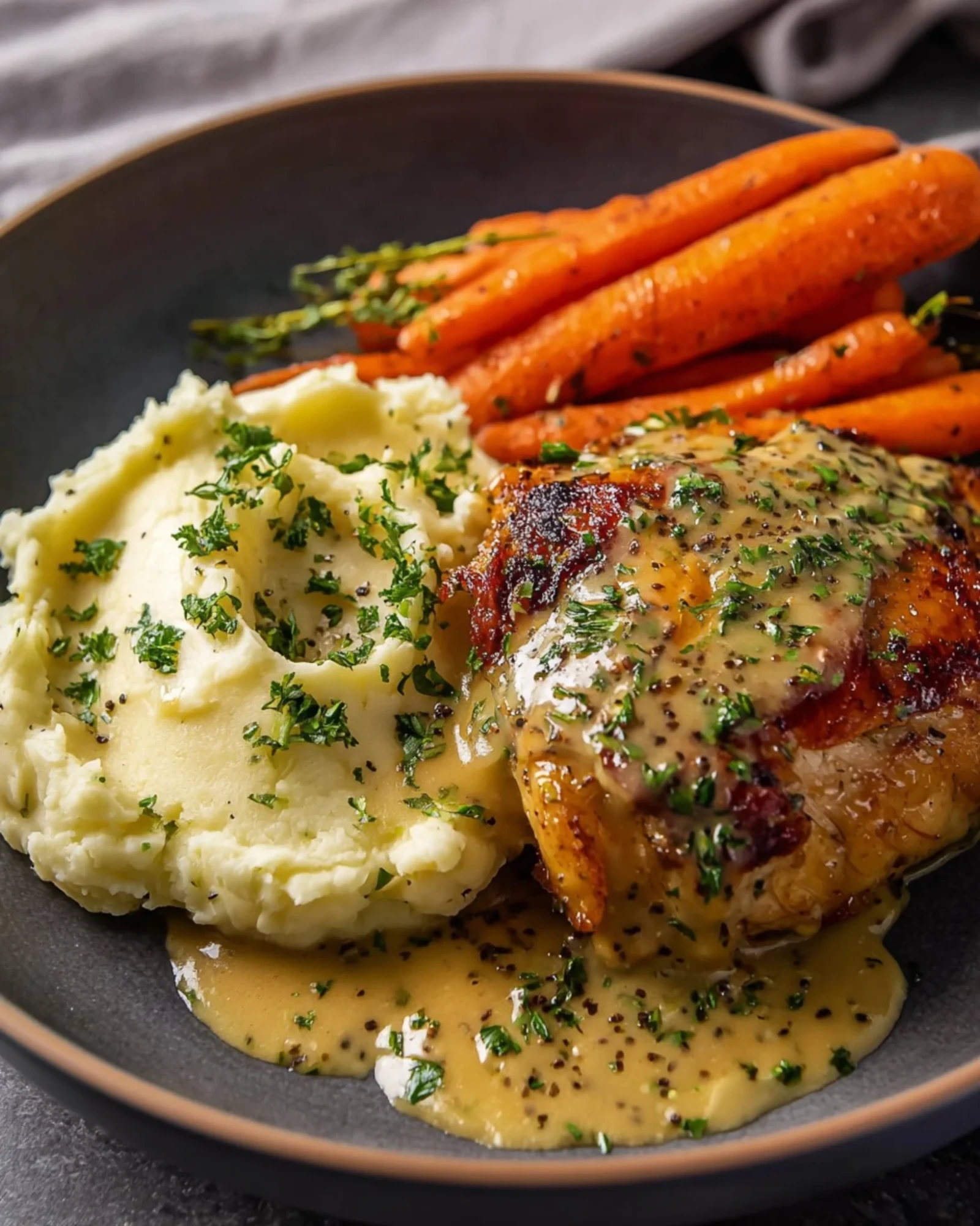 This hearty and comforting dish of Herb-Roasted Chicken Thighs with Gravy, Mashed Potatoes & Glazed Carrots is a satisfying, homestyle meal perfect for Sunday dinner or any time you want a warm, flavorful plate of food. The juicy, well-seasoned chicken is paired with creamy mashed potatoes, tender glazed carrots, and a rich herb-infused gravy.