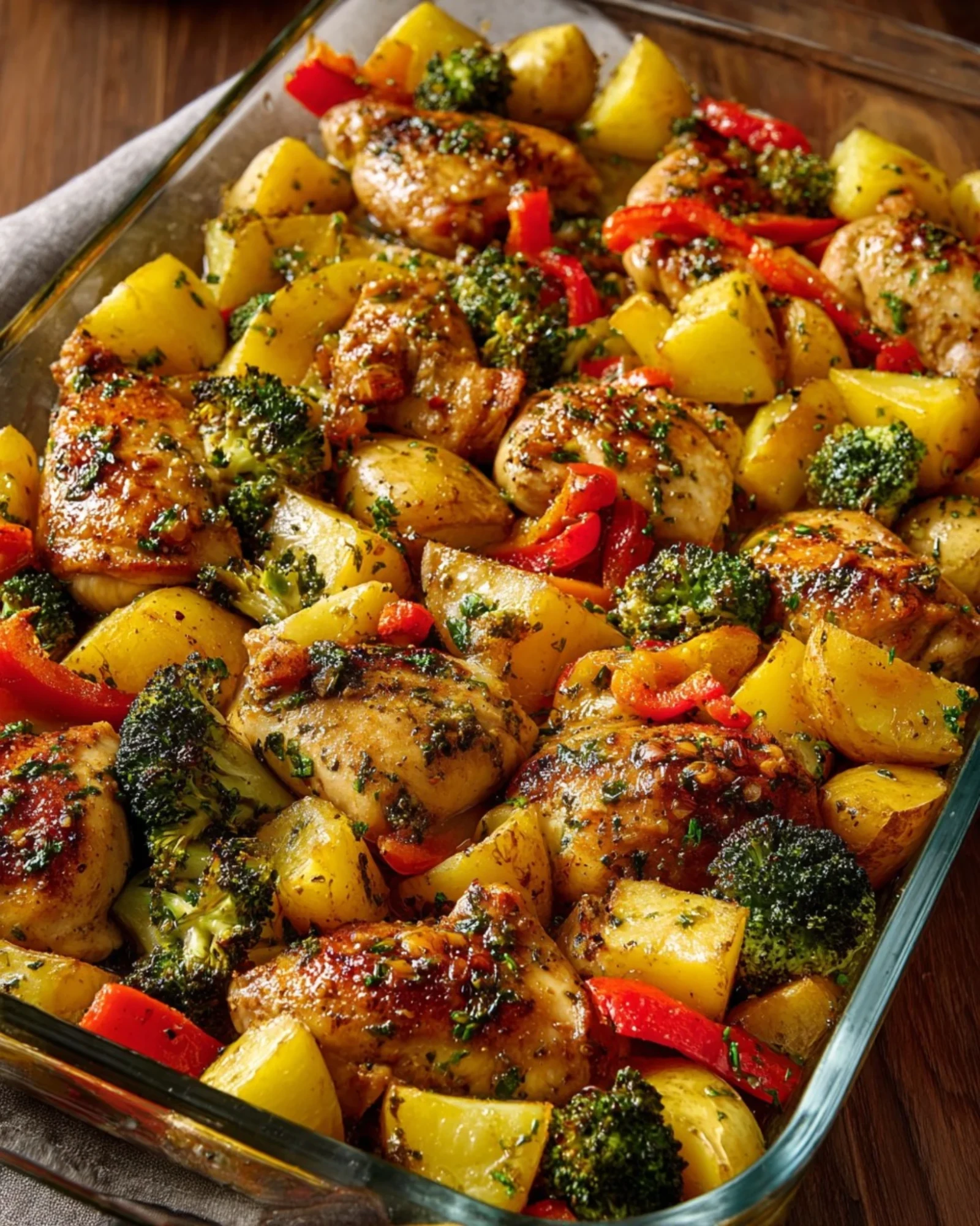 This Herb Roasted Chicken Thighs with Potatoes & Vegetables is the perfect one-pan dinner. It features juicy chicken thighs, tender potatoes, and colorful vegetables, all seasoned with a blend of herbs and roasted to perfection. It’s an easy, satisfying dish for any night of the week.