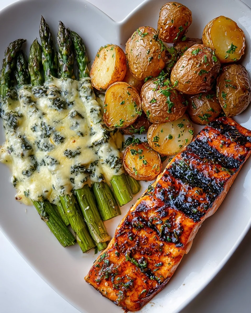 A beautifully balanced dish, this Honey Garlic Glazed Salmon with Cheesy Asparagus & Roasted Potatoes is packed with bold flavors and satisfying textures. The caramelized honey garlic glaze complements the rich salmon, while the roasted potatoes and creamy, cheesy asparagus round out this hearty and healthy meal.