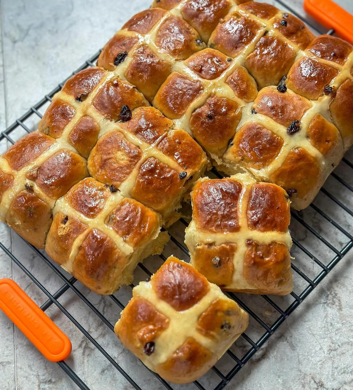 Hot Cross Buns are soft, lightly spiced sweet buns traditionally enjoyed during Easter season. Studded with raisins or currants and topped with their signature flour cross, these tender buns are finished with a glossy glaze for a beautifully golden, bakery-style finish. Perfect served warm with butter, they’re a timeless seasonal favorite.