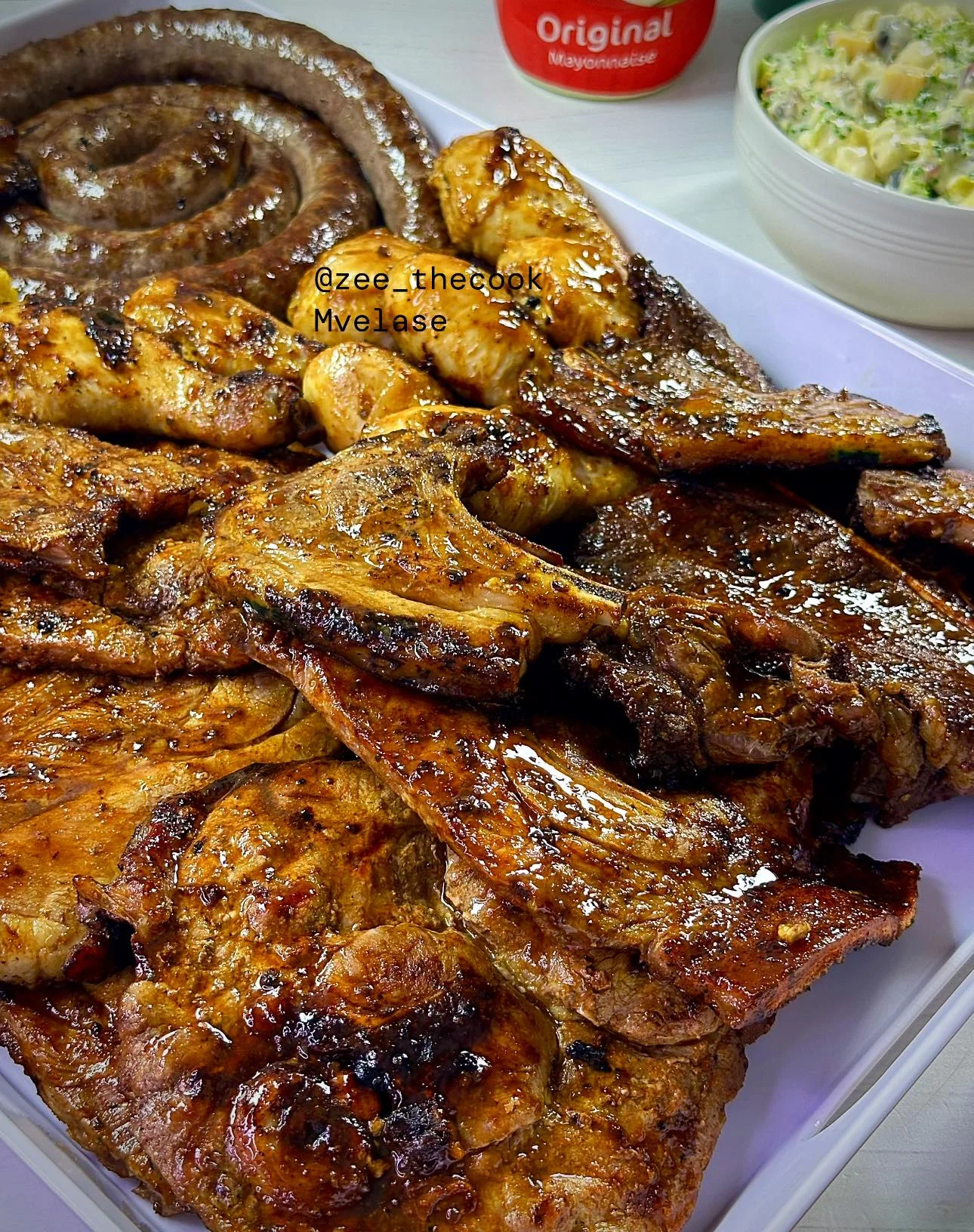 Inyama is a beloved South African-style grilled meat feast often enjoyed during braais (barbecues) or family gatherings. This platter is loaded with flavourful cuts like marinated lamb chops, chicken pieces, steak, and boerewors (traditional sausage), usually served with creamy potato salad and fresh sides. It’s a celebration on a plate, best enjoyed with good company and bold flavors.
