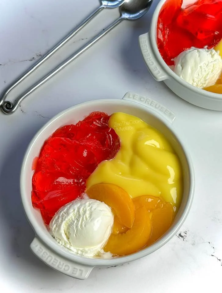 These fun and colorful Jelly Custard Peach Dessert Cups are a nostalgic favorite and a breeze to assemble. With layers of fruity jelly, creamy custard, sweet peaches, and a scoop of vanilla ice cream, they’re perfect for kids and adults alike. A chilled treat ideal for summer or casual gatherings.