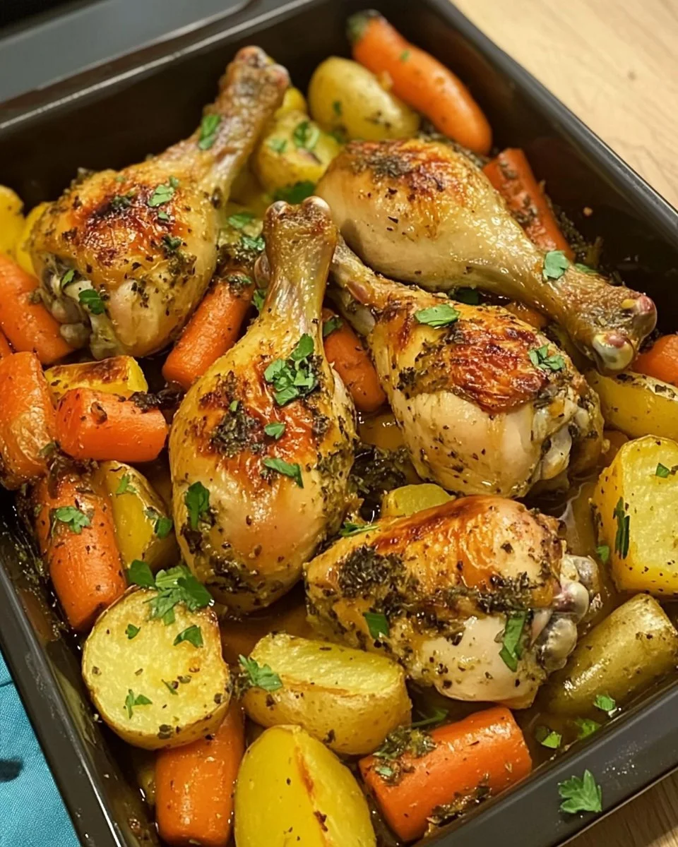 This one-pan meal of Juicy Herb-Roasted Chicken Drumsticks with Potatoes & Carrots is a hearty, flavorful dinner that’s easy to prepare and perfect for busy weeknights. The chicken comes out golden and crispy, while the veggies soak up all the delicious pan juices.
