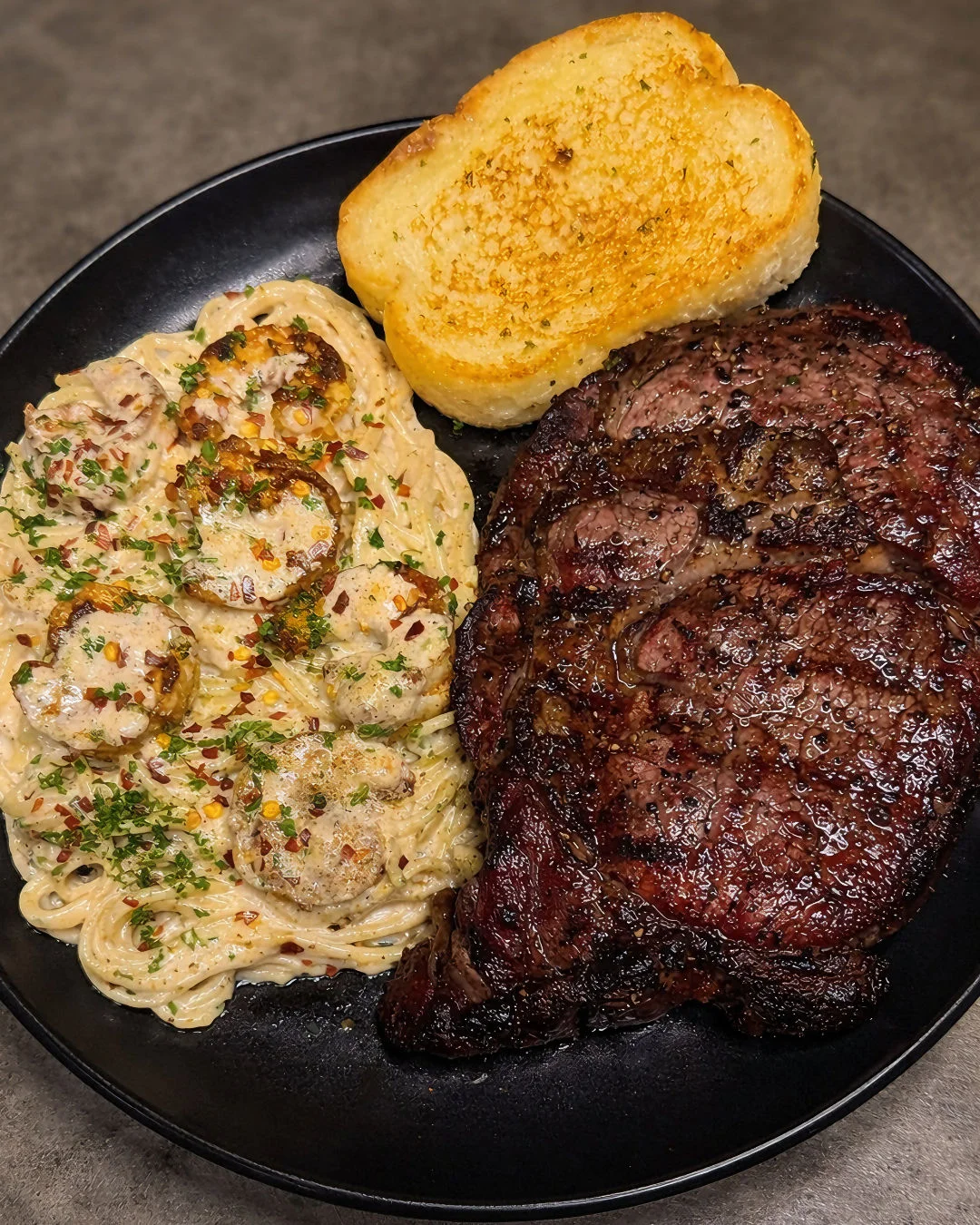 This indulgent dinner plate features a perfectly seared juicy steak served alongside creamy scallop pasta and crispy garlic bread. The rich, buttery flavors of the scallops and pasta pair beautifully with the savory steak, creating a restaurant-style meal that’s perfect for a special dinner at home.