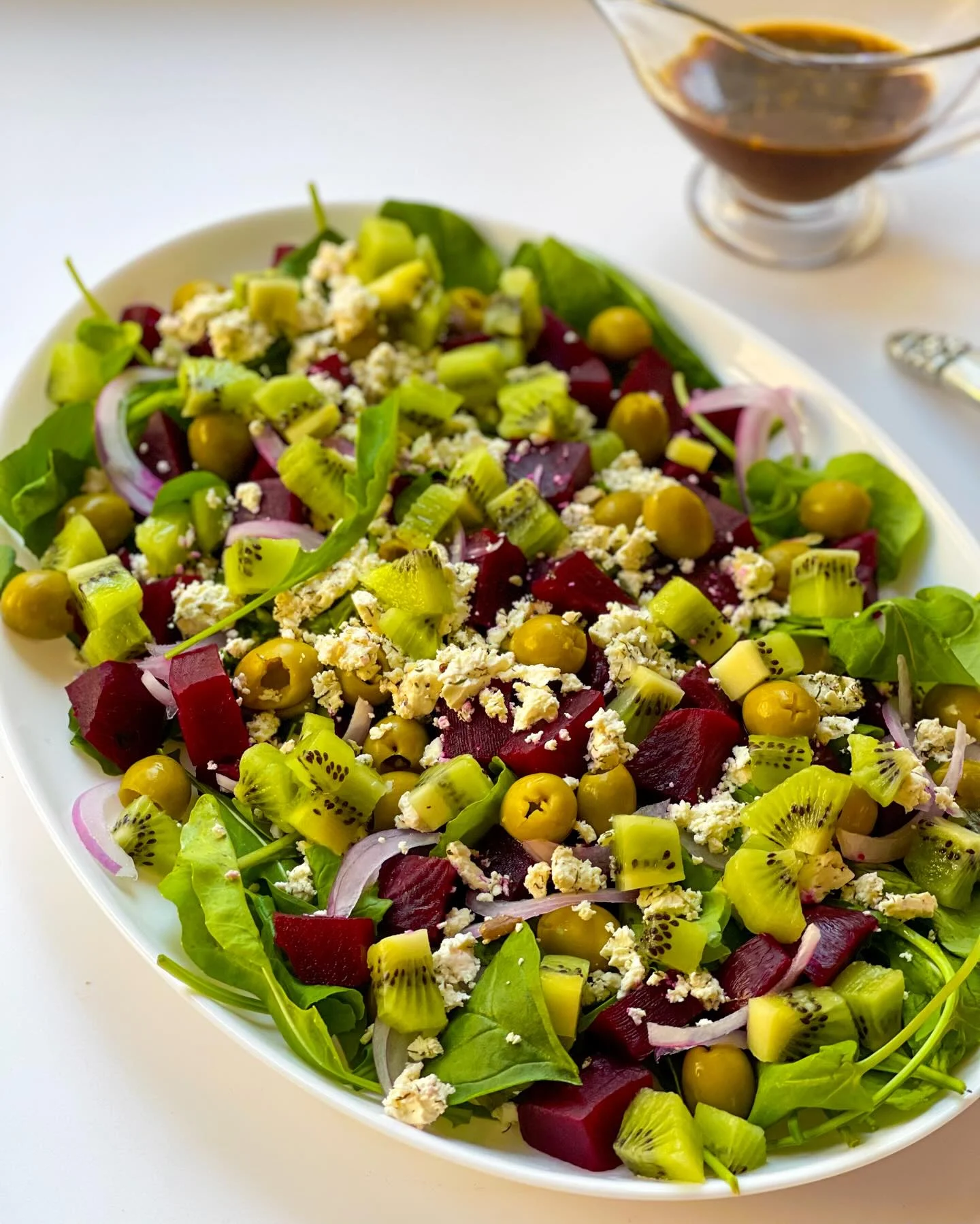 This vibrant and refreshing Kiwi Beet & Feta Salad combines earthy beets, sweet kiwi, tangy feta, and briny green olives over a bed of fresh greens. It’s a colorful and unique salad, perfectly balanced with a homemade balsamic vinaigrette.