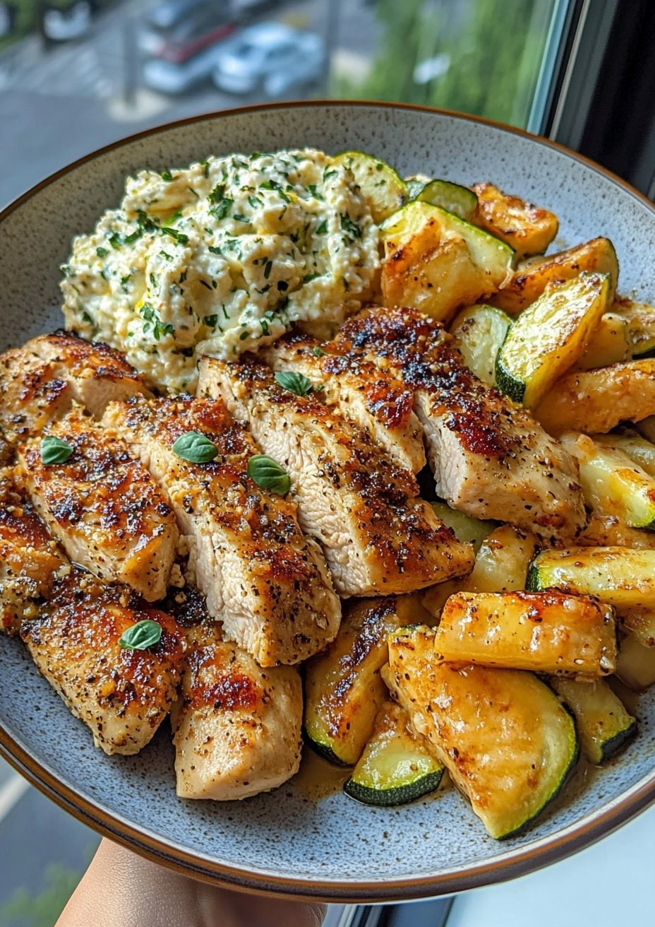 This bright and flavorful dish pairs juicy lemon-basil grilled chicken with a creamy whipped feta Alfredo sauce and crispy roasted zucchini wedges tossed in Parmesan. It’s a Mediterranean-inspired plate that hits all the right notes: creamy, zesty, herby, and crispy.