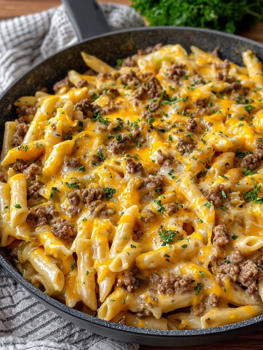 Loaded Cheeseburger Alfredo Pasta is the ultimate mash-up of creamy comfort food and meaty cheeseburger goodness. This easy one-pan dinner brings together cheesy Alfredo sauce, seasoned ground beef, and tender pasta—all topped with even more cheese. It’s perfect for a busy weeknight or a cozy weekend meal.