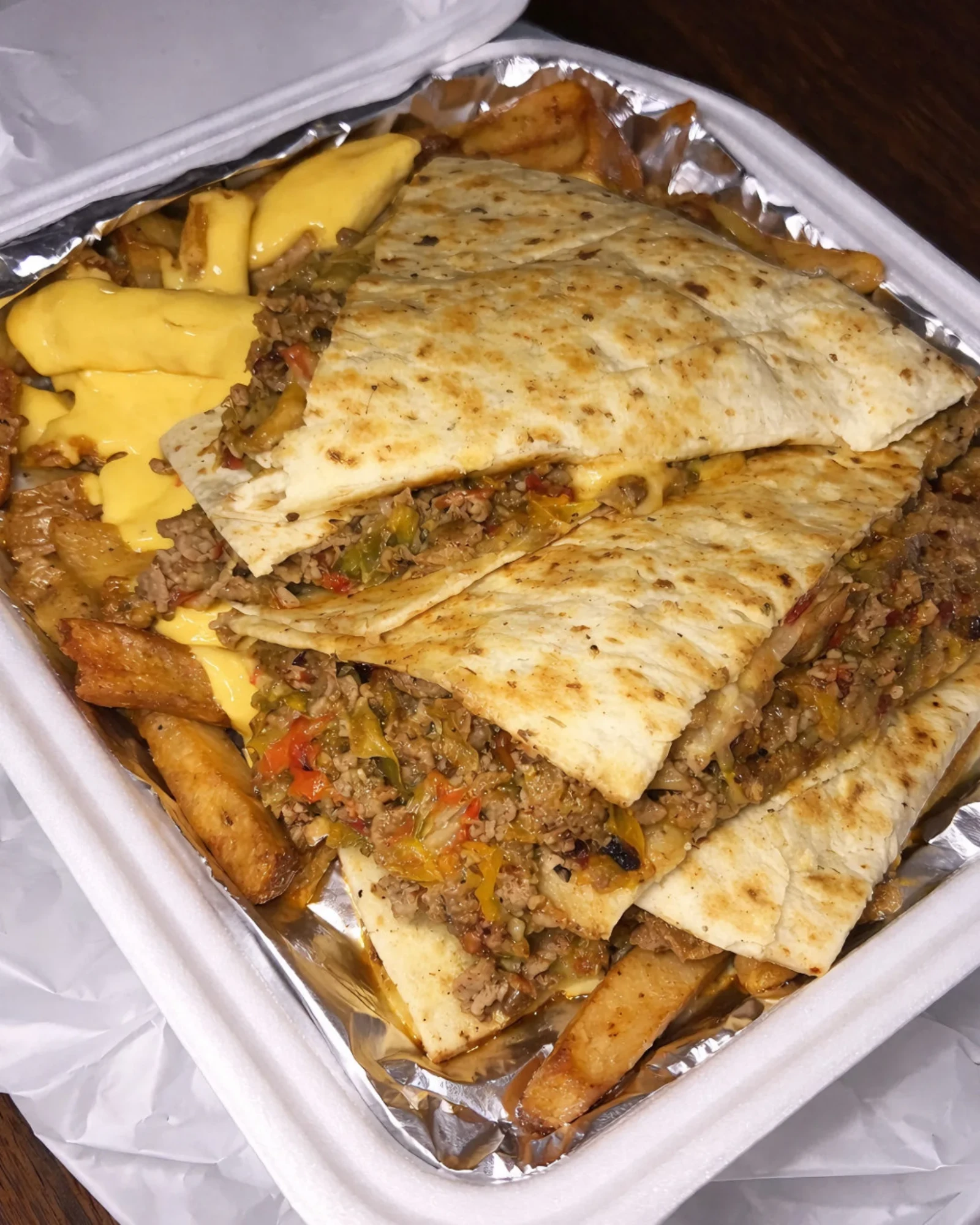 This loaded cheesy quesadilla meal with golden fries is the ultimate comfort food combo. Stuffed with seasoned ground meat, melty cheese, and sautéed peppers, then paired with thick-cut fries drizzled in nacho cheese—this indulgent plate hits all the right spots for a satisfying, crave-worthy bite.