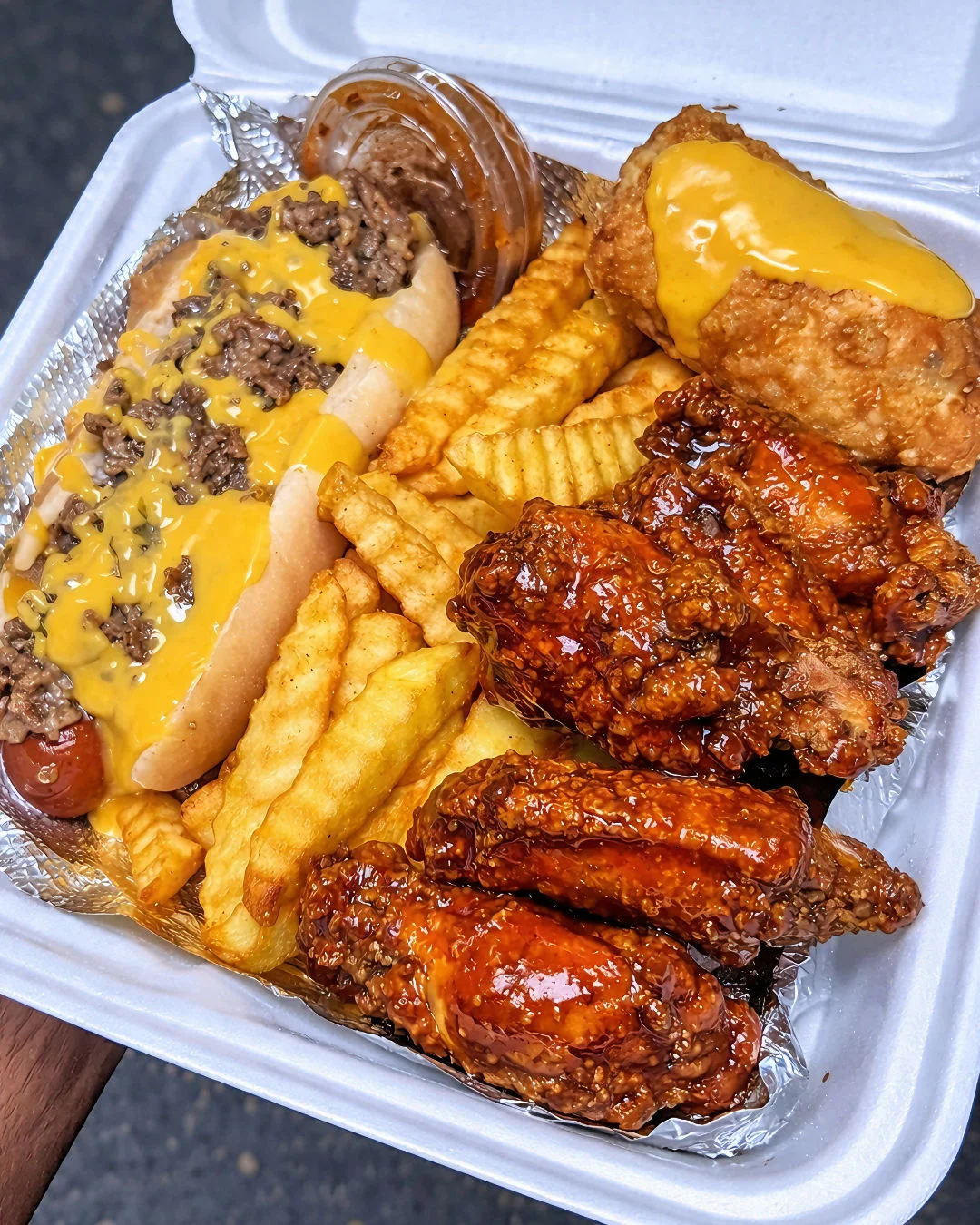 Get ready for the ultimate comfort food feast! This indulgent combo of loaded fries, cheesy hot dogs, crispy fried chicken, and sticky glazed wings brings all your cravings into one mouthwatering meal. Perfect for game nights, parties, or when you’re just in the mood to treat yourself.