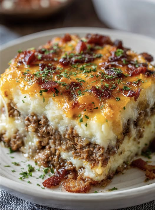 This hearty casserole layers creamy mashed potatoes with savory seasoned ground beef, then tops it all with melted cheese and crispy bacon. It’s the ultimate comfort food—rich, filling, and perfect for family dinners.