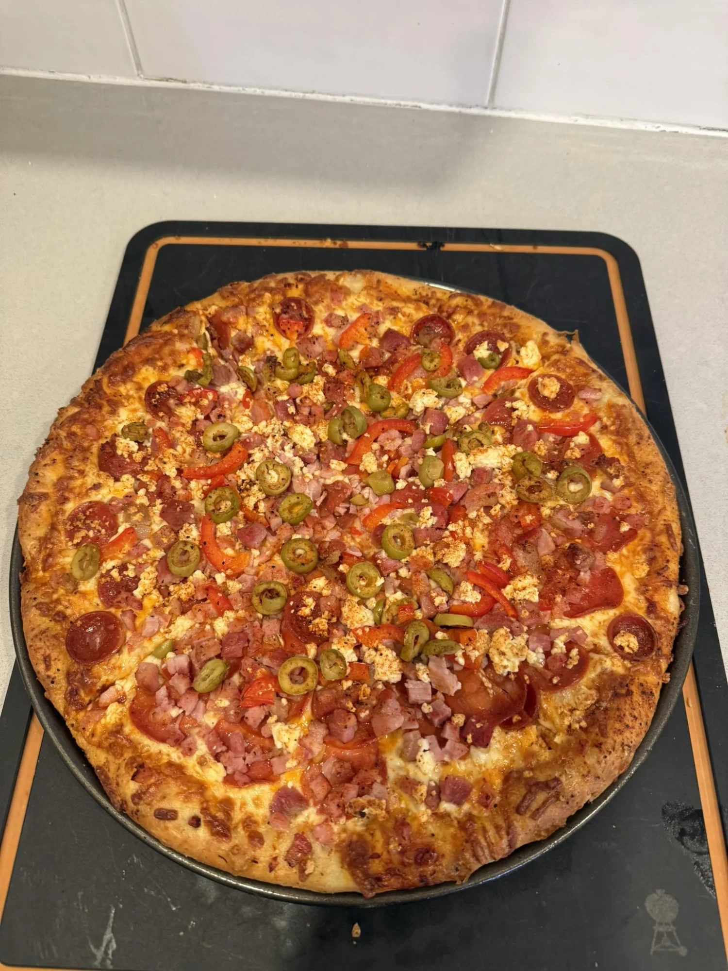 This hearty and flavorful pizza is packed with savory meats, briny olives, and fresh veggies, making it a perfect choice for pizza night. The combination of crispy crust, gooey cheese, and a variety of toppings makes every bite unforgettable.