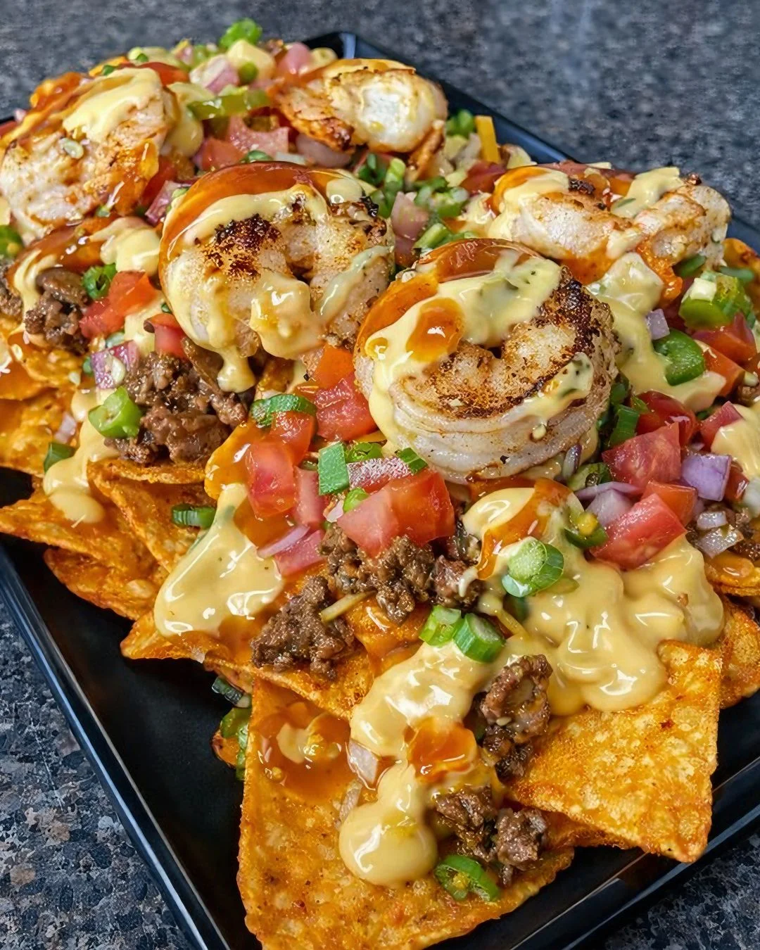 Loaded Nachos are the ultimate crowd-pleasing appetizer, stacked high with crispy tortilla chips, seasoned beef, juicy shrimp, fresh vegetables, and layers of melty cheese sauce. Perfect for game nights, parties, or a fun family dinner, these nachos deliver bold flavor and spicy goodness in every bite.