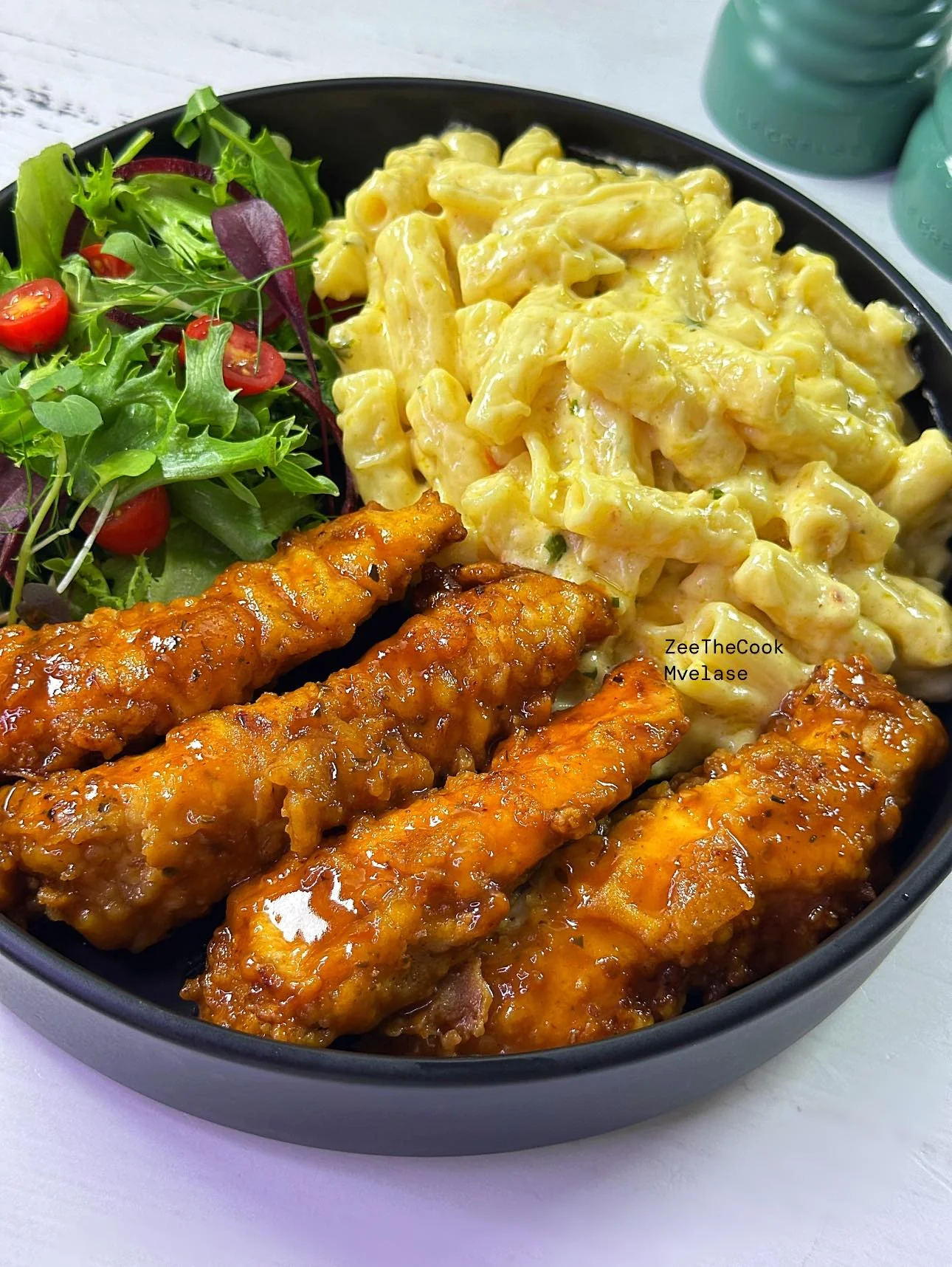 This ultimate comfort bowl features creamy, cheesy mac and cheese paired with crispy chicken tenders coated in a sweet and savory honey glaze. A refreshing side salad adds the perfect balance of freshness and texture to this indulgent meal. It’s a crowd-pleaser that’s great for dinner or a weekend treat.