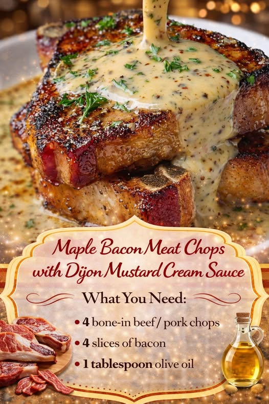 These Maple Bacon Meat Chops with Dijon Mustard Cream Sauce are a savory-sweet delight, featuring juicy chops wrapped or paired with crispy bacon and topped with a rich, creamy mustard sauce. Perfect for a hearty dinner, this dish balances smoky, sweet, and tangy flavors beautifully.