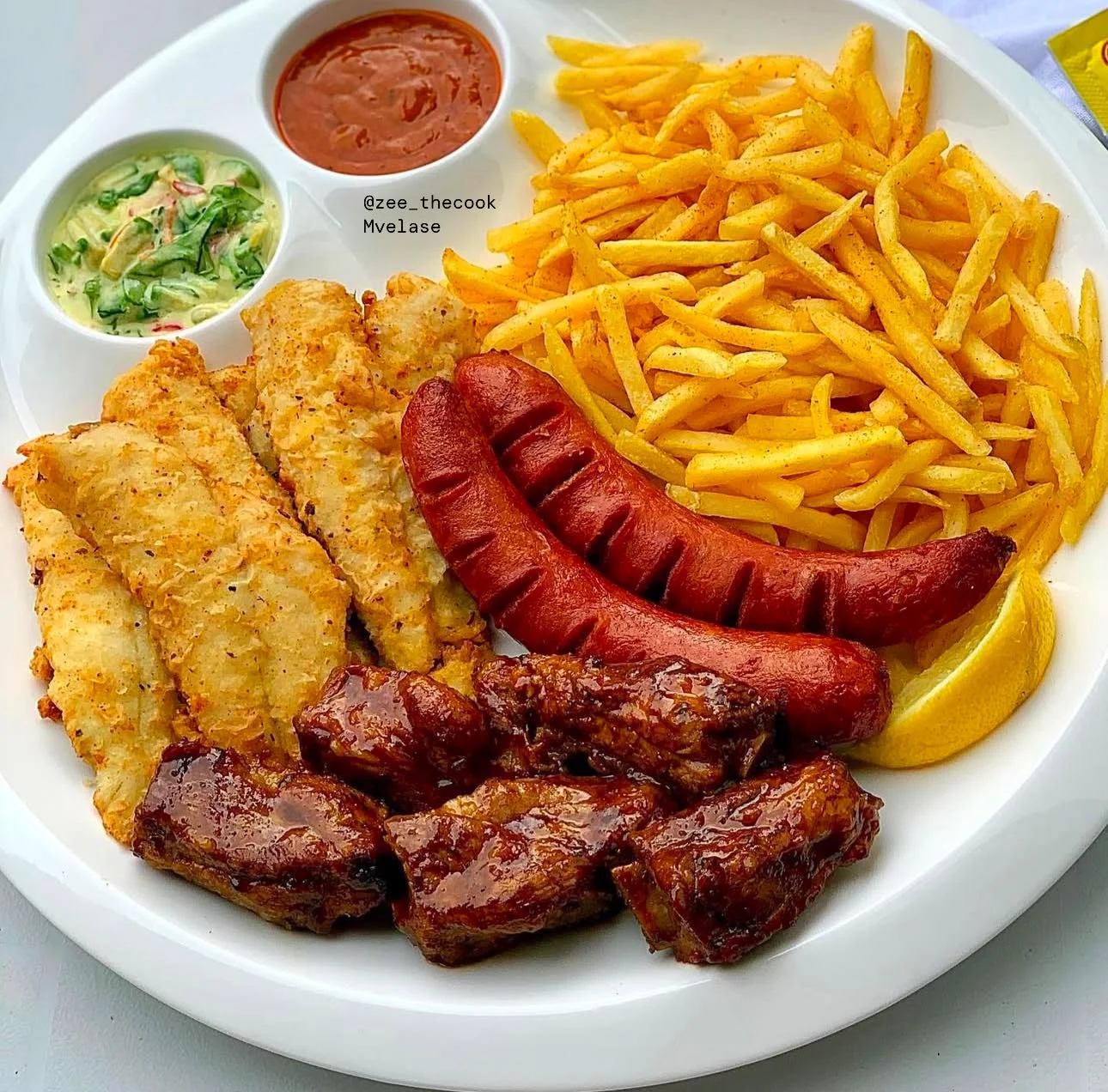 This Mixed Grill Platter is a flavor-packed feast featuring crispy fried fish, juicy grilled sausage, tender BBQ beef ribs, and a generous serving of spicy fries. Served with a refreshing creamy cucumber salad and tangy tomato dipping sauce, this plate delivers the ultimate combo of textures and tastes—perfect for sharing or satisfying a serious appetite.