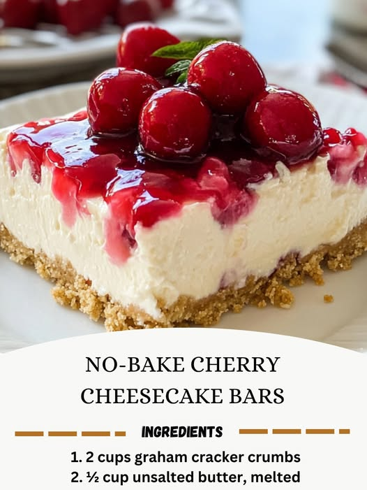 No-Bake Cherry Cheesecake Bars are the ultimate effortless dessert—cool, creamy, and bursting with cherry flavor. With a buttery graham cracker crust, a velvety cheesecake filling, and a luscious cherry topping, these bars are perfect for parties, holidays, or any time you want a sweet treat without turning on the oven.