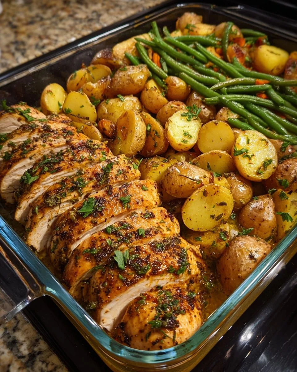 One-Pan Herb Chicken with Roasted Potatoes & Green Beans is the perfect no-fuss dinner that’s full of flavor and easy to clean up. Tender, juicy chicken breasts are seasoned with a blend of herbs and roasted alongside buttery baby potatoes and crisp green beans. It’s a wholesome, balanced meal ideal for busy weeknights or casual family dinners.