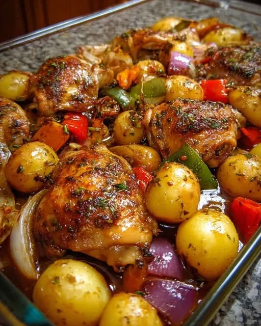 This oven-baked chicken with potatoes and peppers is a flavorful one-pan meal that combines juicy roasted chicken with tender baby potatoes and colorful bell peppers. Seasoned with garlic, herbs, and olive oil, everything roasts together in the oven to create a comforting dish packed with rich, savory flavor and minimal cleanup. It’s perfect for family dinners or an easy weeknight meal.
