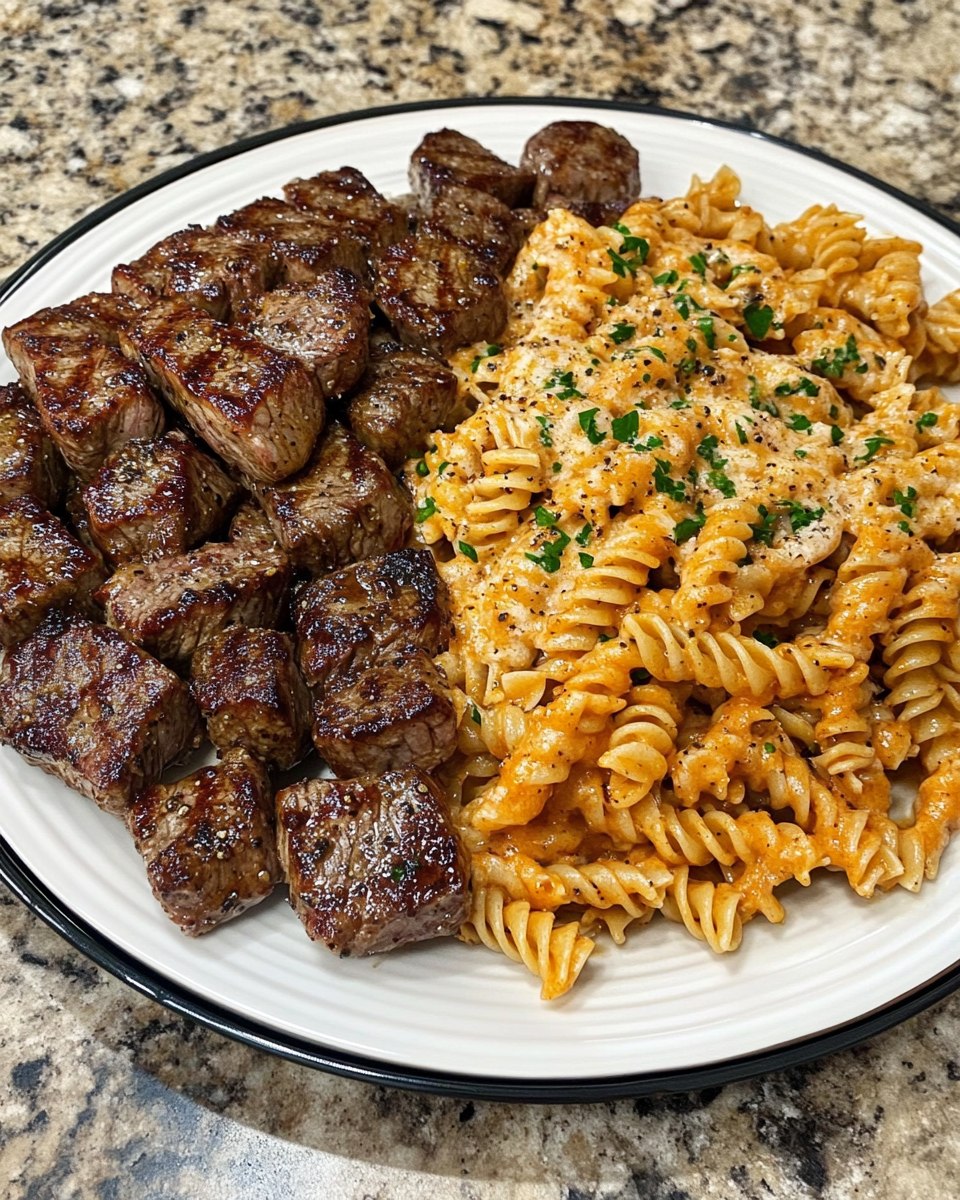 Cajun Garlic Parmesan Steak Bites with Creamy Twisted Pasta