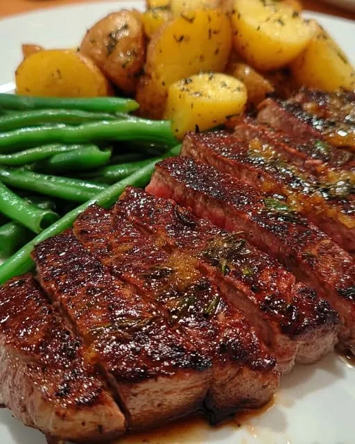 A classic steakhouse-style meal you can easily prepare at home. This dish features a perfectly pan-seared steak topped with rich garlic butter, tender herb-seasoned potatoes, and vibrant green beans for a balanced and satisfying dinner packed with flavor.