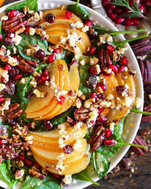 This vibrant and refreshing Pear Spinach Salad is the perfect combination of sweet, tart, and savory. Juicy ripe pears, crunchy candied pecans, creamy blue cheese, and bursts of pomegranate arils come together atop fresh spinach leaves. It’s all finished with a bright and tangy maple-lemon mustard dressing that brings every bite to life.