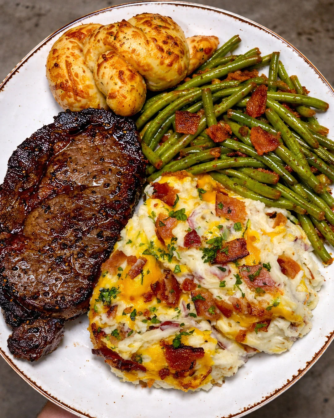 This Perfect Steak Dinner Comfort Plate brings together everything you crave in a hearty, satisfying meal: a juicy, seared steak, creamy loaded mashed potatoes, garlicky green beans with bacon, and a warm, cheesy garlic knot. It’s a restaurant-worthy feast you can enjoy right at home.