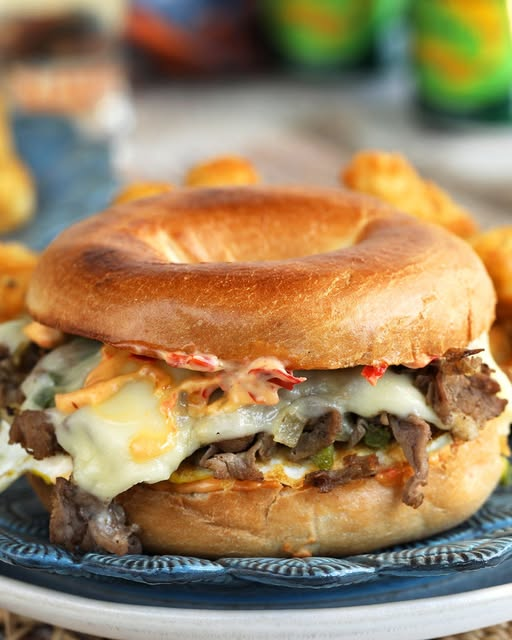 This Philly Cheesesteak Breakfast Bagel is the ultimate savory morning indulgence. Juicy shaved beef, sautéed peppers and onions, gooey melted cheese, and a perfectly fried egg come together in a toasted bagel, topped with a creamy sriracha mayo for an irresistible kick. It’s everything you love about a cheesesteak—reimagined for breakfast!