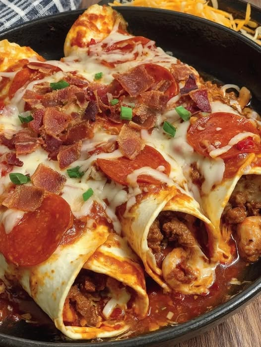 These Pizza Enchiladas with Ground Beef & Pepperoni combine two family favorites into one mouthwatering dish! Soft tortillas filled with cheesy, saucy ground beef, topped with marinara, mozzarella, crispy bacon, and pepperoni — it’s a crowd-pleasing, fun dinner idea.