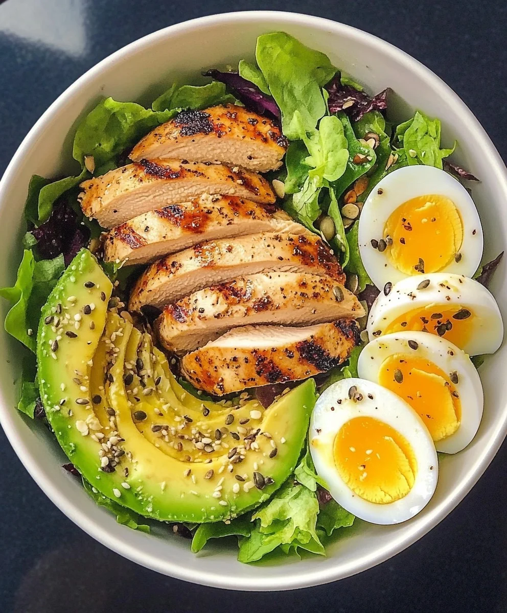 This Protein-Packed Chicken, Egg & Avocado Power Bowl is a nutrient-rich, satisfying meal perfect for lunch or dinner. Loaded with lean grilled chicken, creamy avocado, perfectly cooked soft-boiled eggs, and crunchy greens, this bowl fuels your body with essential nutrients and keeps you feeling full for hours. Ideal for meal prep or a quick weeknight dinner.