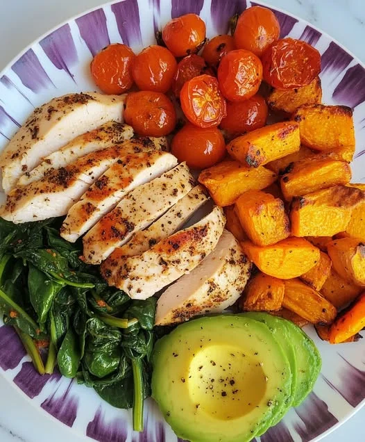 Step 6: Assemble the bowl by placing the sliced chicken in the center and surrounding it with roasted squash, cherry tomatoes, sauteed spinach, and avocado slices. Serve warm.