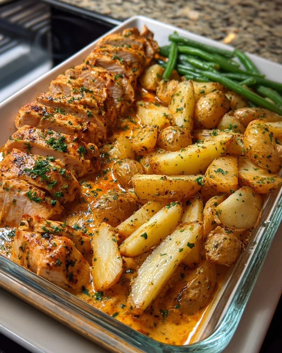 This Roasted Chicken Tenderloin with Herb Potatoes & Green Beans is a wholesome and flavorful one-pan meal. Juicy chicken tenderloin, seasoned baby potatoes, and crisp green beans come together in a delicious, buttery herb sauce that makes dinner both simple and satisfying.