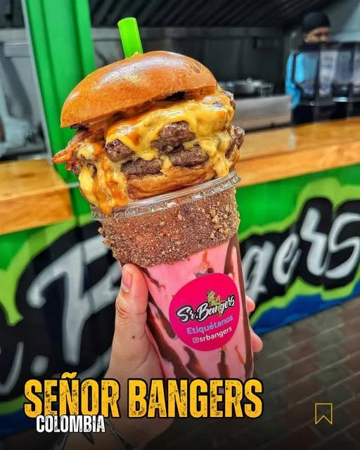 The Señor Bangers Burger Milkshake Combo is an outrageous street‑food creation that combines a stacked cheesy burger with crispy bacon and a thick strawberry milkshake. The burger is served perched on top of the milkshake cup, creating a playful and indulgent food‑truck style treat that mixes sweet, salty, and savory flavors in one unforgettable meal.