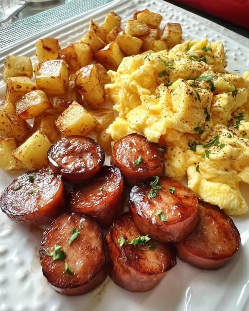 Sizzling Sausages, Fluffy Scrambled Eggs & Roasted Potatoes is a hearty breakfast plate packed with comforting flavors and satisfying textures. Juicy browned sausage slices are served alongside creamy scrambled eggs and crispy roasted potatoes, creating the perfect start to the day or a delicious brunch option for weekends.