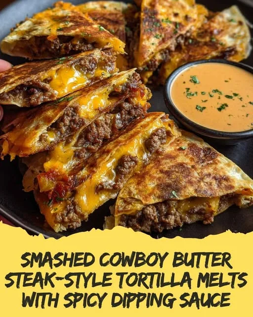 Smashed Cowboy Butter Steak-Style Tortilla Melts with Spicy Dipping Sauce