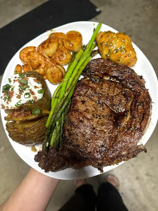 This luxurious dinner plate features a perfectly smoked ribeye steak paired with buttery scallops, seasoned shrimp, crispy hasselback potato, tender asparagus, and a sweet honey butter croissant. It’s a restaurant-quality meal packed with bold flavors and comforting sides.