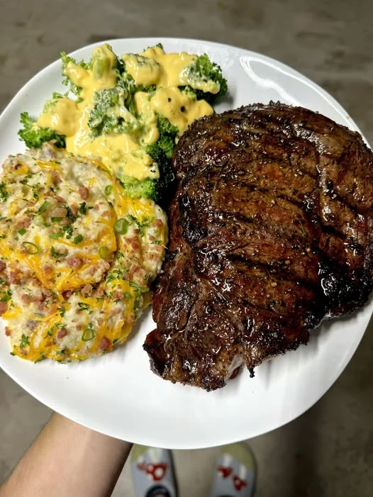 This Smoked Ribeye with Loaded Mashed Potatoes and Cheesy Broccoli is a hearty steakhouse-style dinner packed with bold flavor and comforting sides. A smoky, perfectly seared ribeye is served alongside creamy mashed potatoes loaded with bacon, cheese, and green onions, plus tender broccoli coated in a rich cheese sauce.
