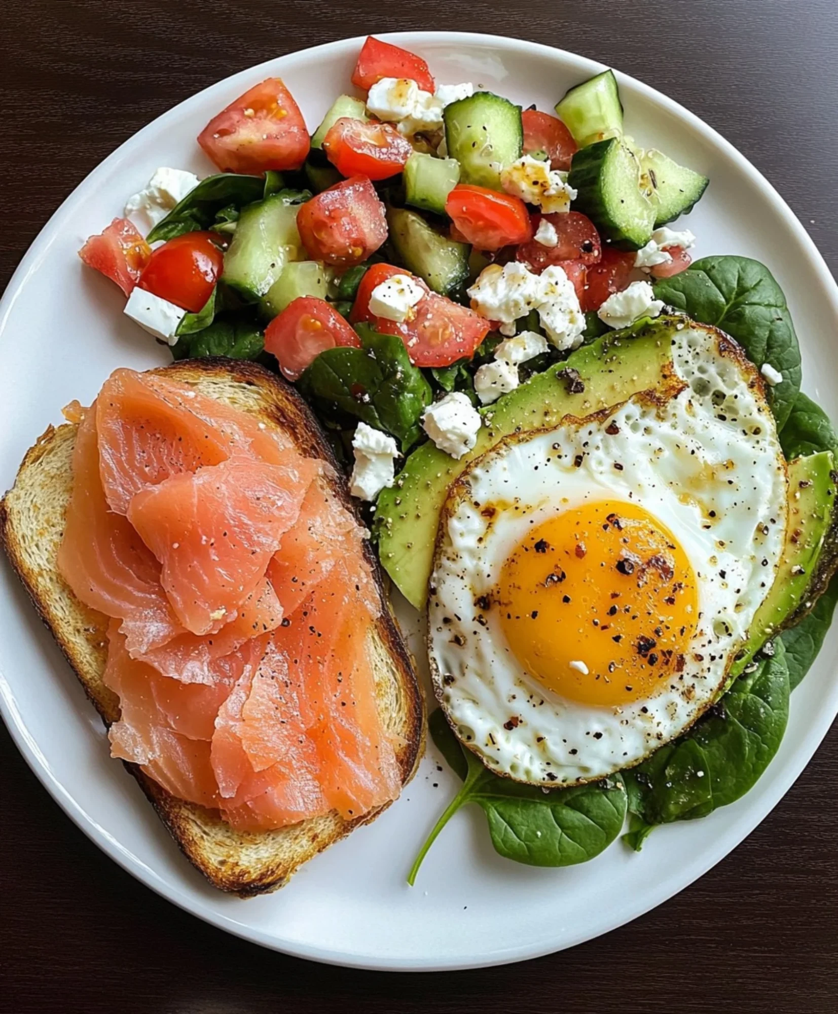 This colorful and nutritious breakfast or brunch plate features toasted bread topped with silky smoked salmon, creamy avocado, and a sunny-side-up egg, served alongside a refreshing spinach, cucumber, and tomato salad with feta. It’s a balanced and satisfying way to start your day.