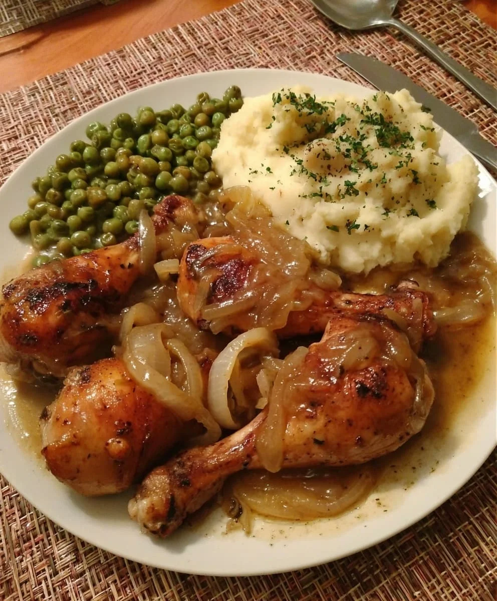 This Smothered Chicken Drumsticks Dinner is the definition of Southern-style comfort. Tender, juicy drumsticks are pan-seared and then simmered in a rich onion gravy until they’re fall-off-the-bone good. Paired with buttery mashed potatoes and sweet green peas, this meal is hearty, flavorful, and soul-warming.